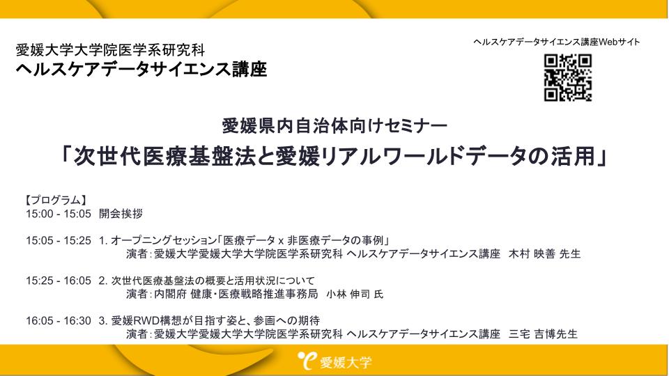 2025年12月9日(火)に、ヘルスケアデータサイエンス講座主催 愛媛県内自治体向けセミナー「次世代医療基盤法と愛媛リアルワールドデータの活用」をオンラインで開催いたしました。